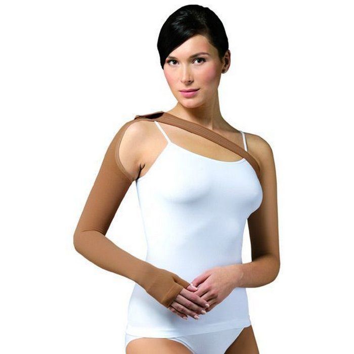 Рукав медицинский эластичный компрессионный, с плечом, с полуперчаткой. Предназначен для профилактики и лечения нарушения оттока лимфы в ранние и поздние сроки после удаления молочной железы, а также травм, переломов, глубоких ожогов, последствий лимфангита и тромбофлебита верхней конечности..Состав